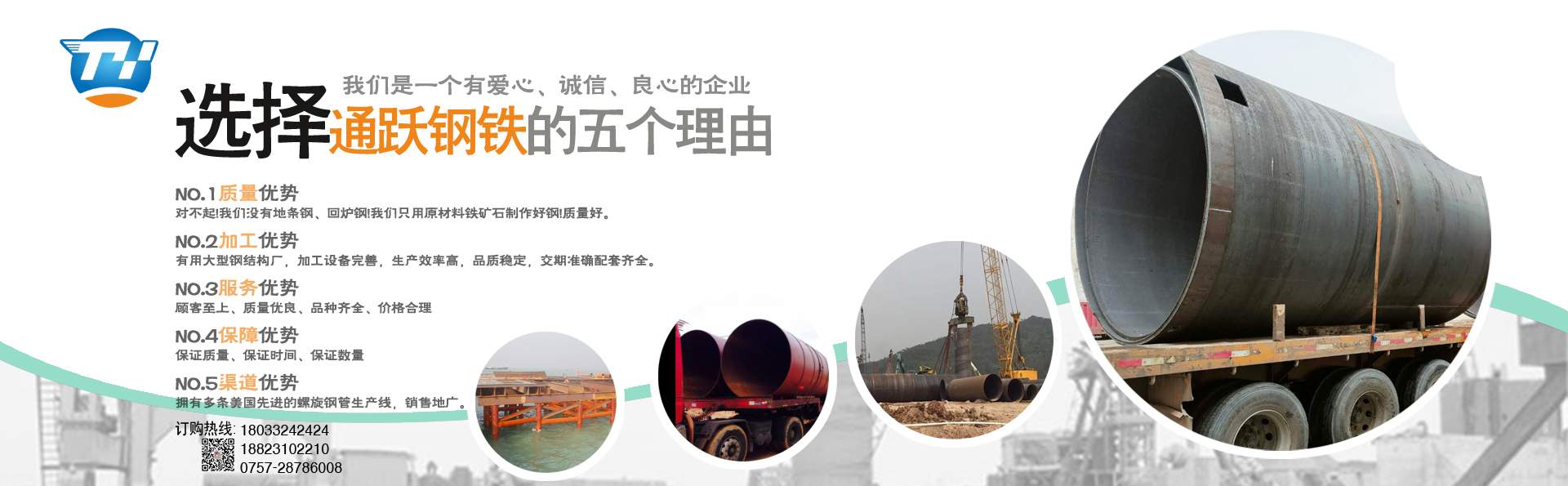 佛山市通躍鋼鐵有限公司 電話180-2228-4448 0757-28786008 擁有多條美國先進的螺旋鋼管生產線,生產直徑φ159-φ3620mm(壁厚6mm-20mm)的雙面埋弧螺旋焊鋼管,年生產能力15萬噸。 生產螺旋管 螺旋鋼管 螺旋焊管 規(guī)格厚度6mm-20mm 直徑159mm-3620mm 有多條鋼板卷管機生產規(guī)格厚度6mm-70mm 直徑400mm-5020mm 螺旋管 螺旋鋼管 鋼護筒 焊接鋼護筒 鋼板卷管 丁字焊管 加工格構柱 鋼管樁 材質Q235B Q345B Q235A 45# 20# Q420D Q390D 錳板 歡迎來電報價,公司配有大型型材 鋼板倉庫,大量各種規(guī)格現貨H型鋼 槽鋼 角鋼 工字鋼 鋼板,鍍鋅方管 鍍鋅產品 產品可以定尺定長,提供打砂,除銹,上油漆,公司配有防腐加工廠,專業(yè)對鋼管進行內外壁防腐加工,鋼管外壁主要有三油兩布,五油三布,環(huán)氧煤瀝青及環(huán)氧樹脂漆,各種高分子涂料。鋼管主要有飲用水涂料IPN8710-2B,水泥砂漿及各種環(huán)氧涂料,IPN8710飲用水防 ……了解更多